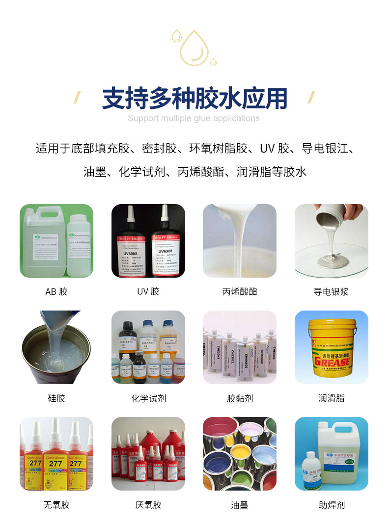 产品描述:可实现快速点胶粘接、灌注、涂层、密封、填充等工艺,适用于LCD液晶屏、COB、扬声器、喇叭、电源适配器、电子玩具、鸣器、电子元器件、家用电器等领域。