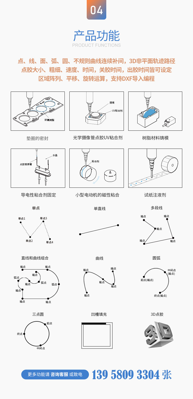 产品描述:可实现快速点胶粘接、灌注、涂层、密封、填充等工艺,适用于LCD液晶屏、COB、扬声器、喇叭、电源适配器、电子玩具、鸣器、电子元器件、家用电器等领域。